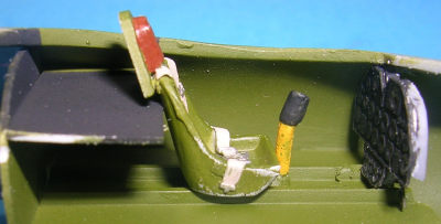 I discovered that, no matter how I positioned the cockpit floor, the instrument panel was just too tall to fit properly. Ultimately, I figured the pilot really didn’t need those bottom instruments so simply cut off the bottom portion and crammed the rudder panels underneath. I also was perturbed by the open chasm behind the seat, so used some sheet styrene to simulate an instrument deck of sorts. So much for “out of the box!” I decided that the Model Master enamel Interior Green I had on hand was a good enough color for the cockpit and liberally airbrushed some on. A little yellow to the grip on the control stick to match the restored one Air Force Museum added a colorful, if probably historically inaccurate, touch.