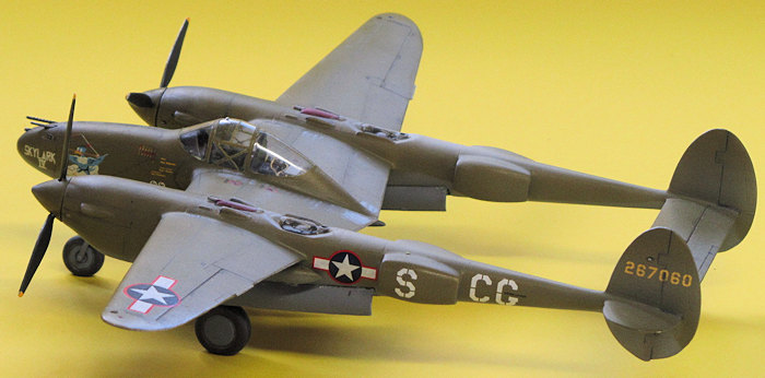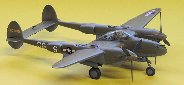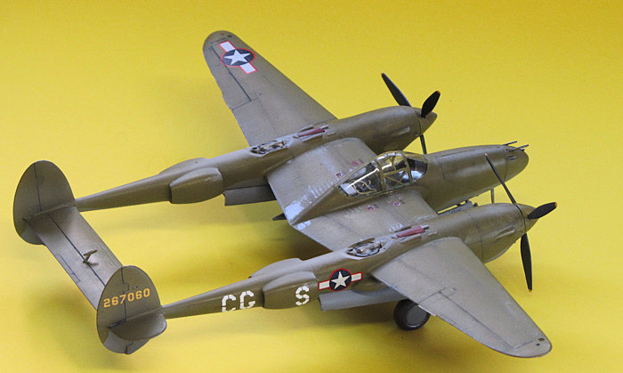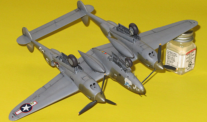 White primer was applied, followed with a preshading. The effect of technique is somewhat lost in 1/72 owing to the P-38's petite proportions. Standard USAAF OD/Medium Grey camouflage then was sprayed using Testor's square-bottle enamels, lightened with a bit of white. Remember that USAAF underside grey was a much darker color than most modelers realize, being really close in shade to the OD. Two coats of Future prepped the surface for decals.