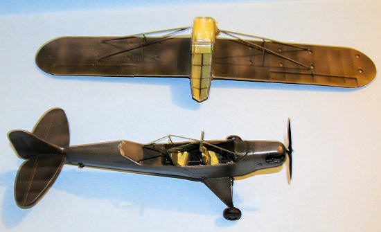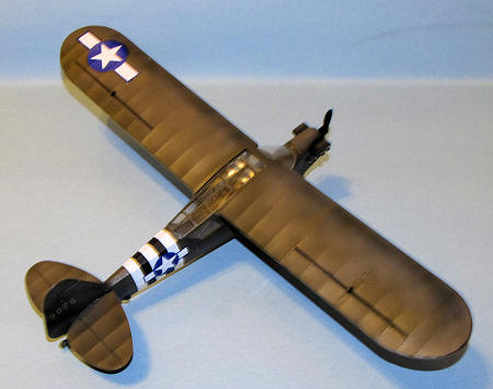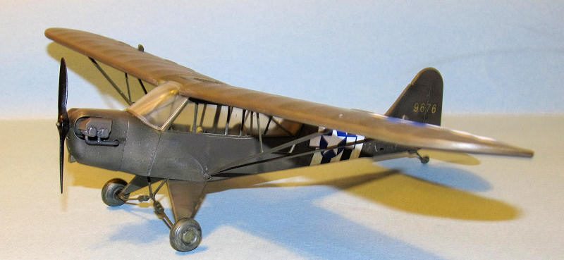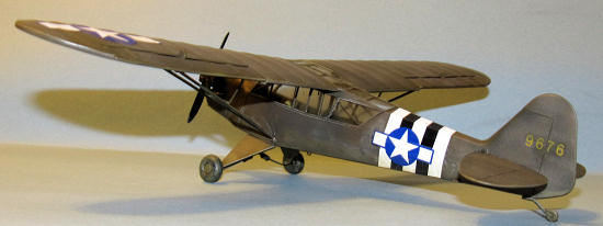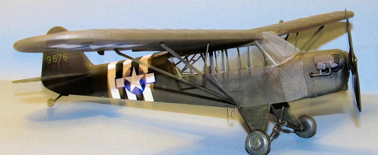 I glued the wheels on the landing struts and added the boarding step. Next the engine pieces were added. The last piece to be added was the prop which popped into place and I had a finished L-4 Grasshopper.