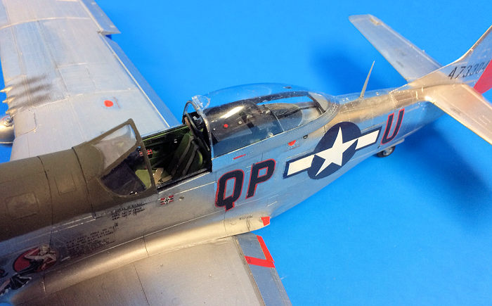 I began the painting by spraying the red nose. Once dry, I masked the outline of the nose using 3M pin-striping tape. I then used Scotch blue painters tape to mask the red area (I left the rudder off the model so it was easier to paint red). I then sprayed the Alclad, achieving a very shiny surface – so shiny that I was worried my model would resemble a newly restored, highly polished P-51D rather than a worn warbird. Nevertheless, I proceeded with the assembly, and here was my big mistake: I somehow assumed that one could handle Alclad-painted surfaces without sealing them first (I have found that sealing metal paint surfaces can considerably alter their appearance). Boy, was I wrong! I resorted to the internet, and found mixed reviews about handling Alclad without sealers. The bottom line for me was that I couldn’t, and the situation was probably exacerbated by my use of Brasso (note that I did clean off the Brasso residue with rubbing alcohol; thus, I can only assume that the polished surface didn’t allow provide an ideal adhering surface for the Alclad application.