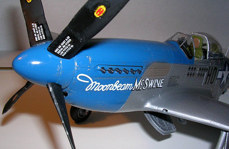 The Blue: Sam Sox, 352nd Group historian provided me years ago with the lowdown on the blue nose color. I also have acquired some actual chips with the 2 different colors. Basically, the blue used up to around September 1944 faded quickly and was a paler blue that they called “Medium Blue.” After the change, it was a darker shade of blue that held up better over time that they called “Deep Sky Blue.” Moonbeam survived the change but because of the nose art, the Medium Blue was kept under the “Moonbeam.” I decided to use the earlier shade overall and did not use all of the kill markings to make it hopefully a little closer to reality. The Medium Blue is a mix of mostly Testors Chrysler Engine Blue and a little bit of Blue Angel Blue.