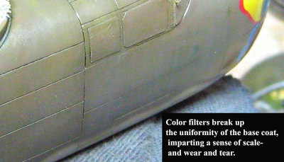 I’m a firm believer in a good, weathered finish to a hard-working, war-weary aircraft. It’s easy to overdo, so go lightly. Black is not a good choice unless you’re working on a black plane, so use browns, greys and darkened versions of your base colors for your washed and airbrush shading. I post-shaded the panel lines and wear areas, then laid down a coat of Future to protect this delicate work- and the decals. Next, thinned oil paints were lightly washed over the panel lines, and wiped with a Q-tip dampened with Humbrol thinner, stroking along the direction of the slipstream. The paint job is coming to life! Some irregular patches of darker base color were sketched in here and there to break up the neatness of the color. It’s now time for another coat of Future.