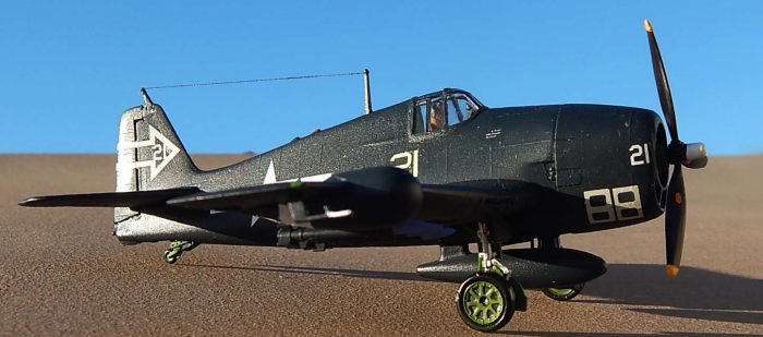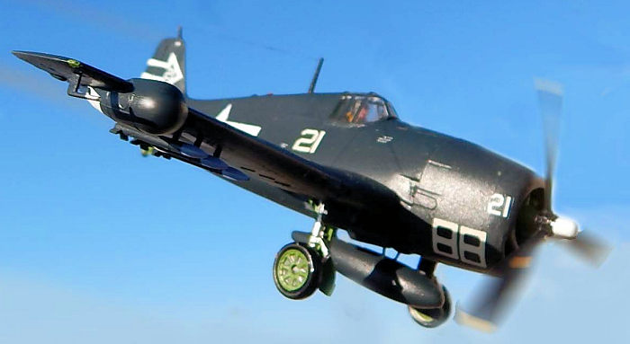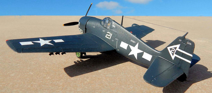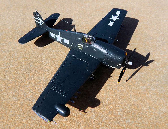 Kit was sprayed in Compucolor Sea Blue. All interiors were chromate green. Pilot figure painted to USN gear. Wing star and bars are from Blackbird Models BMD 72009, the markings came from Super Scale decal sheet No72-124 which are those of Squadron VF(N)90 US Navy. Model was given a final overall coat of semi gloss lacquer.