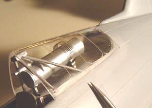 The life raft container behind the pilots seat is next, the nice etched direction finder installed, and the rollover cage. Note, the plans call for the container to be aluminum, but it should be black. Of course I found this out after it was too late. Now, the rear canopy area. I wanted this to look right as it is a signature of the Brewster's looks, and decided to fair it in to the fuselage correctly, even if it meant extra work.