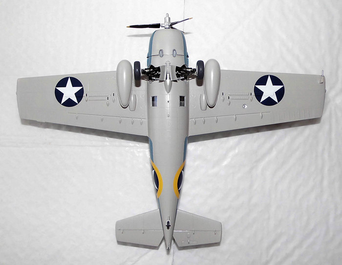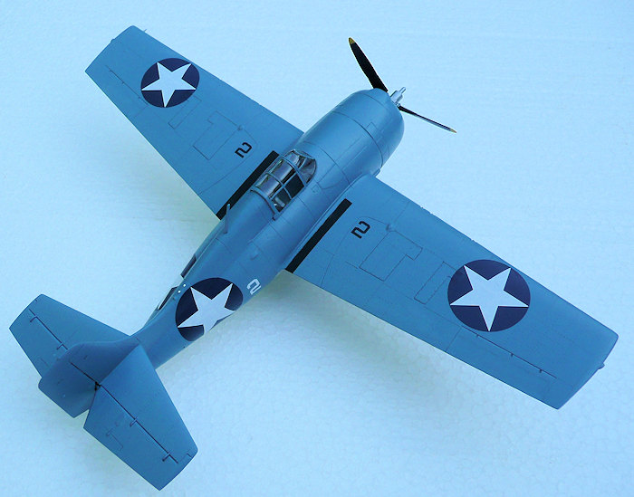 The paint scheme was quite similar to my Tamiya build, as I had chosen to model the aircraft of Lt. Cdr. John Raby from VF-9 aboard the USS Ranger during Operation Torch in November 1942, so as before the under surfaces went grey (Humbrol 129) and sides and upper surfaces Blue Grey (Model Master 2055).