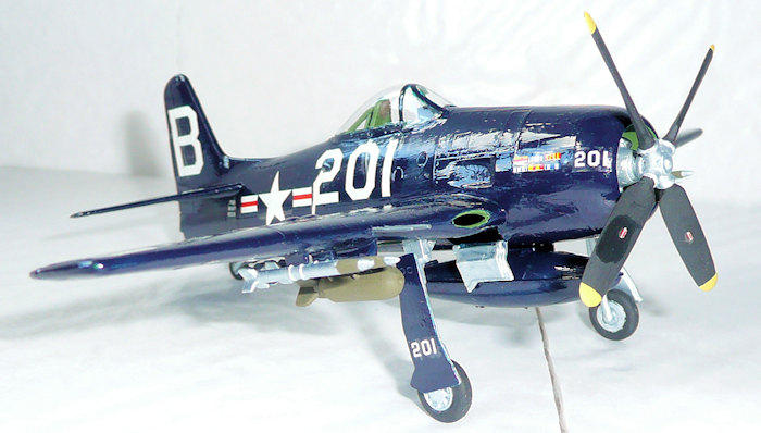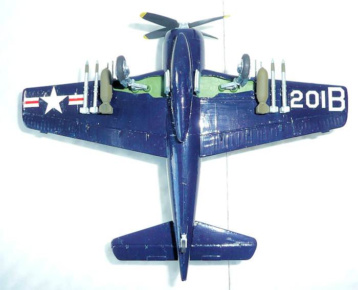 Despite their age the decals went on with no hassles other than there was silvering – a lot of it! Especially the small numbers at the cowling edge were reluctant to stick well to the surface because of the curved shape of the cowling, but when dry I Gloss Coted the decals and around them (not the whole surface of the model was gloss coted; that I deemed unnecessary), I was actually able to eliminate almost all of the silvering. At the same time I marked four spots with the gloss cote on the prop blades for the prop logos, as they seemed prominent on pictures and I was also complementing some other prop planes at the same time. I used some Hamilton Standard logos even though I’m aware the Bearcat had an Aeroproducts prop, but I only had Hamilton Standard and Curtiss Electric logos at my disposal. Anyway I reasoned the Hamilton Standard logos to closely look enough like the Aeroproducts ones to use them. The only things left to do was the marking of the navigation lights, gluing the under wing stores in place and, after securing the propeller logos with Humbrol Matt Cote and pushing the prop in place, the model was finished.