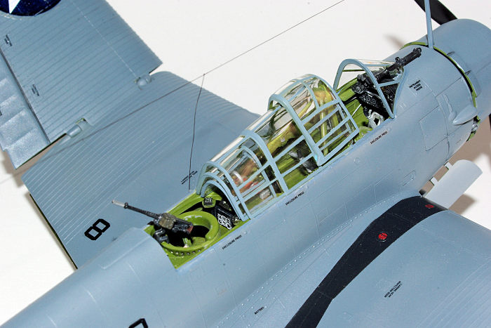 The model's fuselage and cockpit openings were filled with tissue wrapping paper and masked before airbrushing. Unfortunately I did not have a supply of ANA Blue Gray so I decided to try a custom mix of Testors Model Master Intermediate Blue with generic black and white added to try to match the ANA color chip in the Monogram US Navy color guide book. In retrospect it looks like the color is too blue and too light. I lightened Humbrol Matt Gray #27 (I have a large supply and need to use it up) with Testors Model Master Insignia White to match the corresponding ANA color. On “Black 8” I did not pre-shade panel lines with black since the contemporary photos seem to show little weathering as the aircraft carried the colors only a few months before Midway. I also wanted to try Tamiya panel line wash for the first time. I tried to make the coverage tones somewhat variable across the sections of the model to avoid a uniform appearance. After the color coats had dried I airbrushed Testors Glosscote lacquer prior to decal application. The wing corrugations caused some problems with the decals laying down despite several applications of Microset and Solvaset although after about six sessions of fine needle puncture of decal bubbles and Solvaset the decals went down flat. The very complete Starfighter sheet provides sufficient markings and stencils for two complete planes but allows up to eight different specific aircraft schemes due to different combinations of markings and insignia from different dates. These include a TBD-1 from squadron VS-42 (May 1941), three VT-6 planes from March 1941 through April 1942, a VT-2 plane from May 1942 at the Battle of the Coral Sea, and three VT-8 planes, one from February 1942 and then LTCR Waldron's T-16 and Ensign Gay's T-14 from Midway. Bureau numbers for four different aircraft are provided. Unfortunately the specific aircraft BuNo for the VT-6 aircraft I selected are not included so rather than apply incorrect numbers I left the numbers off the vertical fin.