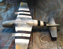 I covered the D-Day stripes back up again making sure that the tape was tight. The bottom received Medium Sea Grey. When dry, I used tape along the aft fuselage and bottom of the stabilizers, poster putty for the engine cowl. The next color shot was Ocean Grey. That was faded with a mix that was 50%white. The areas in the control surfaces and the flaps were faded, leaving the rivet line the base color. The effect is quite subtle; enough so that I am not sure it comes across in the pictures.