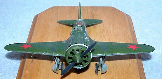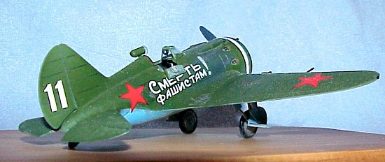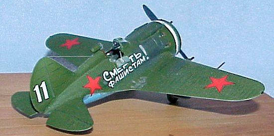The I-16 was called by many names by the pilots who flew her: Yastrebok, or ‘Young Eagle’ in the USSR, Mosca, or ‘Fly’ by the Spanish Republicans, Rata, or ‘Rat’ by the Nationalists, and Abu, or ‘Gadfly’ by the Japanese. This particular model is the Type 18 of Capt. Boris Safanov of the 72 AP, 1941. The sayings in Cyrillic along the sides are, as close as I can gather, "Death to Fascism!", and "All behind Joseph Stalin!"