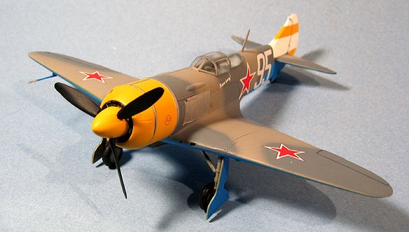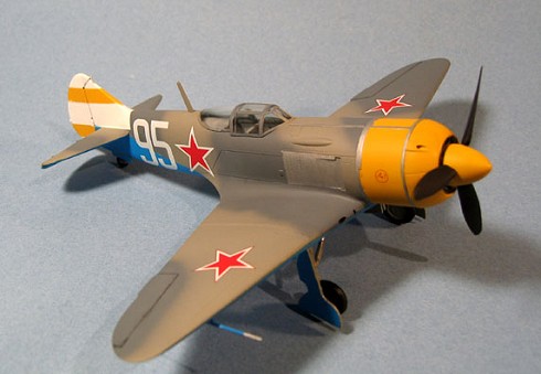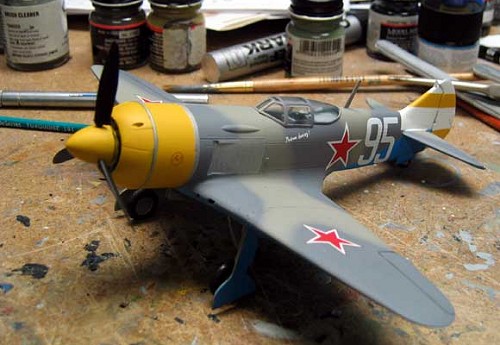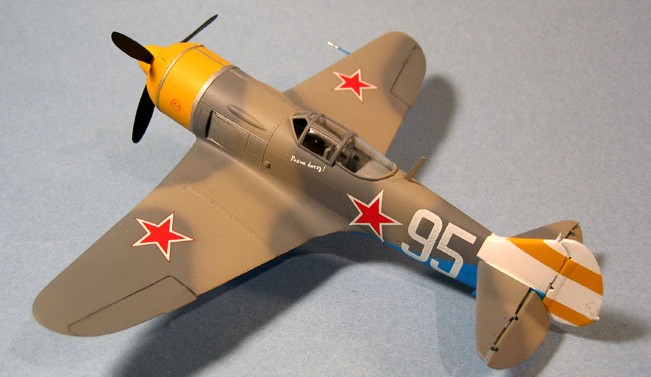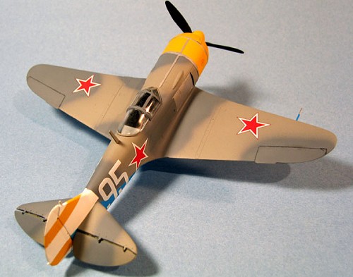 Originally, this kit was supposed to be an experiment to do a What-If paint scheme on a La-7. I had thought of using Lt. Col. S.F. Dolgushin’s scheme, but with the red replaced by yellow. A quick Photoshop session using a scan from the Osprey Soviet Aces of World War 2 convinced me it was the way to go. Now, before anyone starts saying that no Soviet fighter could have wore so large an area of yellow for fear of confusion with the German planes or lack of patriotic feelings, a quick browse through the aforementioned book shows a few aircrafts with rather large patches of yellow. Case closed.