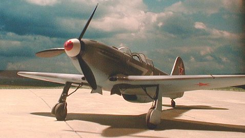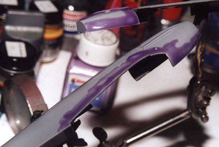 Looked into VVS resource page. Paint alchemy seems to be near as mystical as with Luftwaffe (sigh). Determined on doing yellow 15, a two-tone grey camo scheme. Mixed light blue paint for undersides. Sprayed undersides. Considerable problems with airbrush. Paint clogged, mixture probably too heavy. Got it sprayed anyway. All my preshading is gone. Postshaded with RAF medium sea grey. Again applied light blue. Very satisfied with result, at least until I realized Iīll have to make some corrections, especially around the radiator. Iīll see to this tomorrow. Tonight prestigious boxing fight.