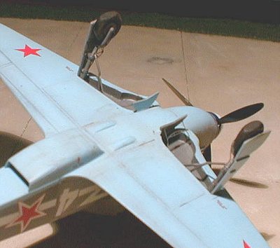 It really wasnīt such a good idea to give the undersides another shot of paint after watching the boxing fight. The several beers may have had some effect, too. Had to redo quite a lot in the way of shading and spraying light blue, but now things look quite alright for me. Iīll have to wait for the paint to dry, then polish it a bit and recoat with clear gloss paint before I can continue in earnest. Have given the question of which scheme to use yet some more thoughts and decided to do Roger Marchiīs White 4, a plane of the free french Normandie-Niemen regiment. Photographic evidence doesnīt show all that much concerning how hard or soft the borders are, but Iīll do hard demarcations between underside and camo, and soft borders between the light and dark gray of the camo. But before I do that, Iīll have to complete the cockpit and canopy.