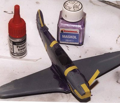 Mounted gunsight, glued front part of canopy with white glue, placed middle part of canopy with Maskol. Polished and masked undersides.