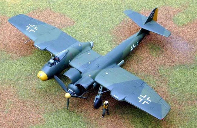 In short, what history? Yet another of those German drawing board aircraft, the Blohm & Voss factory designed this one in 1944 as a single-seat multi-role aircraft. It never got off the drawing board, although it was almost completed. It was to have been equipped with bombs of various sizes. The design offered a high ground speed and good climbing performances. Standard armament was to have been two 151 machine guns and two heavy cannon. The configuration of the powerful BMW 801 radial in the asymmetrical fuselage and the Jumo turbojet engine under the cockpit nacelle represented a bold design for the time. The performance was to have excelled the Dornier Do-335.