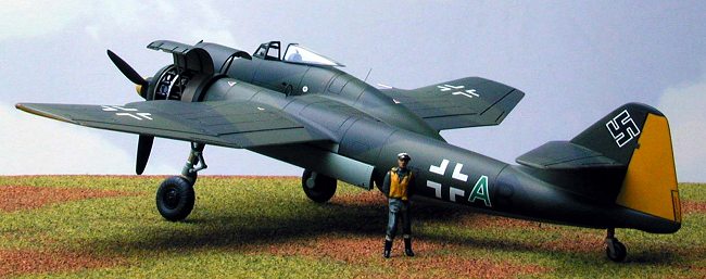 The model was primed in RLM 65 and areas masked to paint the nacelle nose, under wing tips, and rudder RLM 04 Yellow. All was masked and the uppers painted the RLM 80 Olive. The instructions were blown up to scale and templates made to cut from masking tape to cover the Olive Green. All upper then received a spray of RLM 70 Black-Green.