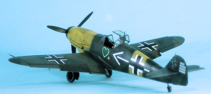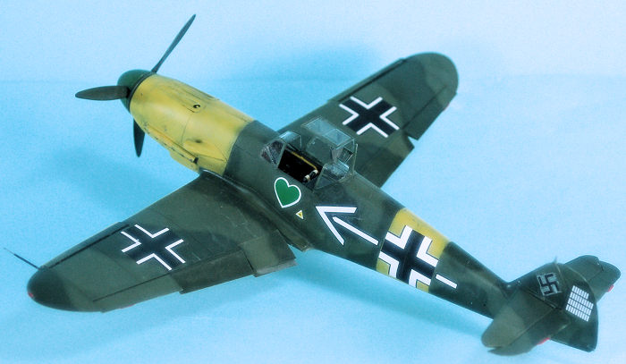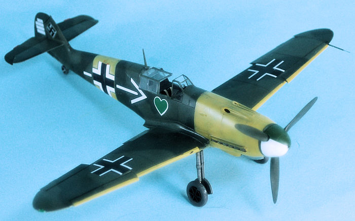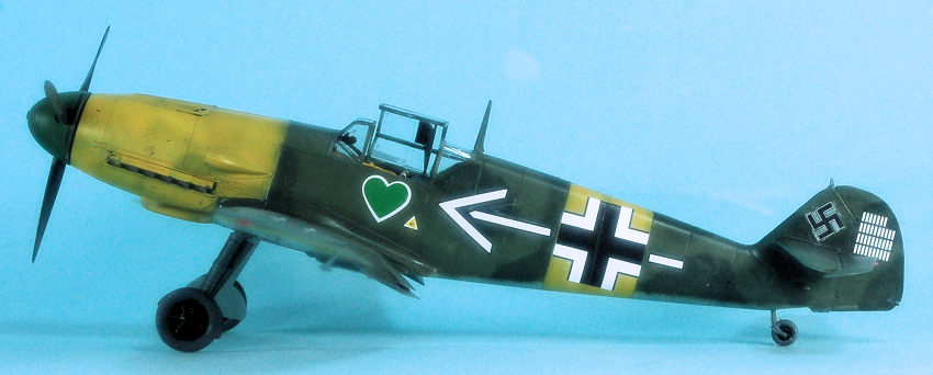 When the He-51 proved itself no match for the Soviet I-15 and I-16 fighters, three prototype Bf-109As were sent to Spain, and Trautloft converted to the new fighter, scoring three more victories in Spain. He adopted the Green Heart symbol of his native Thuringia as his personal insignia at this time.