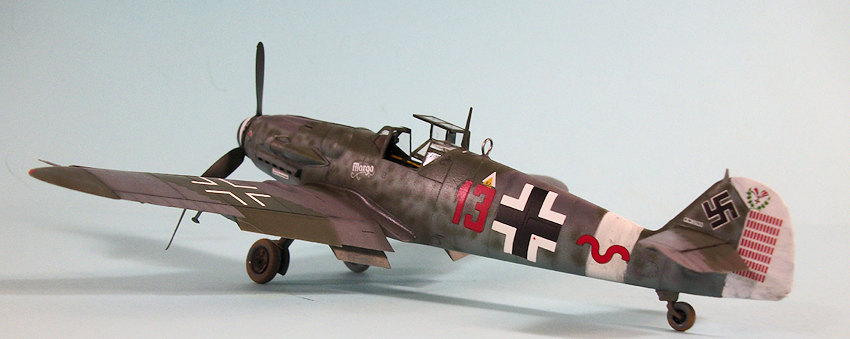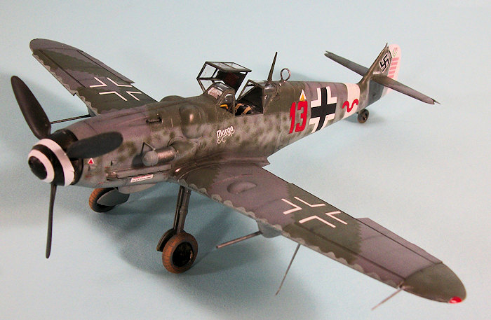I had already determined I was going to do an earlier Bf-109G-6, and settled on Bartels’ famous “Rot Dreizehn”, which is a very colorful airplane. There are not really a lot of photos of the airplane, but there is one in particular that is important, since enough of the left wing is shown to demonstrate that the airplane was finished in the “Erla-style” zig-zag camouflage. This means that, while it was a G-6, it would have had the “Erla Buele” on the right side first developed for the G-5. All illustrations of this airplane show it with the standard “bump” on the right, but the camouflage is determinative. Erla did all their G-5s and G-6s with the same piece.