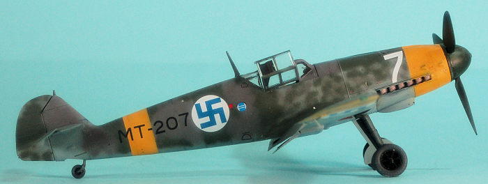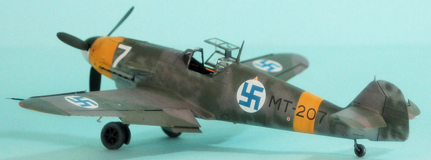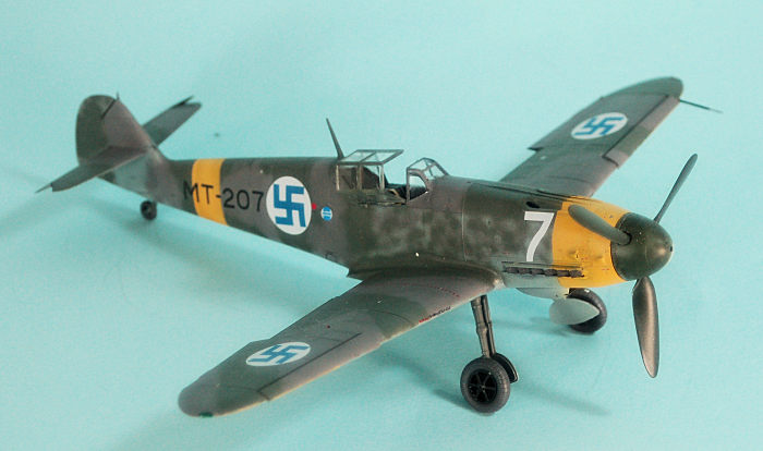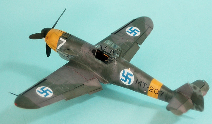 After preshading the panel lines, I applied the yellow markings per the detailed profile provided with the decals, then masked those off. I applied RLM76 which I mixed from Tamiya paints, then applied the RLM74 and 75 upper colors. The airplane I was modeling had been painted in the field following delivery to the Finns, and I carefully followed the profile to get the fuselage blotch camouflage. The wings and horizontal stabilizer were in standard camouflage factory paint patterns. When finished I gave the model an overall coat of clear gloss and allowed it to set up overnight.