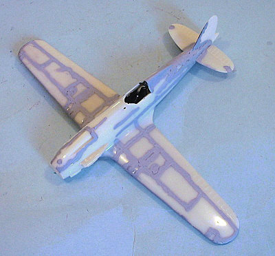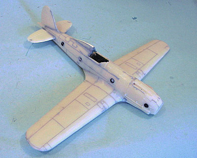 The kit surface detail is a bit heavy. I sanded down the overdone ribs in the fabric covered control surfaces, which was really all that needed to be done. I then outsmarted myself by filling in the panel lines with Mr. Surfacer 500, sanding them smooth when dry, and rescribing them. The result does not look as good as hoped. In fact, the heavy panel lines of the kit would have looked just fine under several coats of paint.