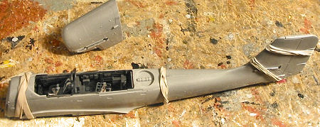 I then attached the windscreen and the central canopy in position and tacked the pilot and gunner canopies in the closed position after masking them, in preparation for painting.