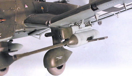 The Ju 87G was the final version of the Stuka, armed with two 37mm Rheinmetall-Borsig BK3,7 anti-tank cannon, which fired fired special armor-piercing ammunition with tungsten cores, at a muzzle velocity of 850m/sec. They carried pods fitted outboard of the landing gear, with the ammunition in six-round clips. The 7.9mm or 20mm wing guns were deleted and - since dive-bombing was not possible with the additional weight of the guns - the dive brakes were also deleted.