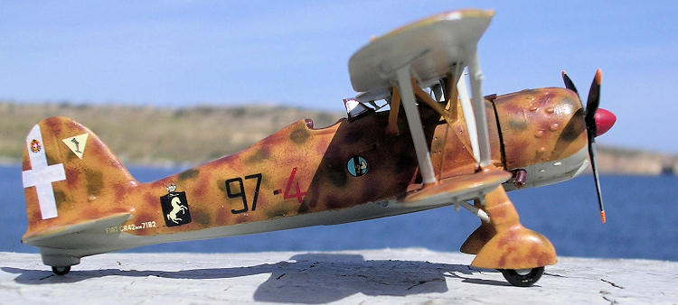 The CR 42 carried very interesting camouflage, which varied from one unit to another. Also there was variation within the same unit. Basically the camouflage consisted of sand background with blotches of green and red brown while the lower surfaces were light grey. I used Humbrol paint and first airbrushed the light grey undersides. The first coat revealed some imperfections during constructions that were attended to and the lower surfaces were airbrushed once more in light grey. After drying these were masked and the upper areas airbrushed in sand to match the upper fuselage pre painted area, which was painted during the setting of the upper wing. After drying, while the cockpit was still masked the airbrushed was primed with green and using the XF nozzle applied small blotches at irregular areas. This I used light pressure with 40% thinner mix. The same method was used this time using red brown for more irregular blotches. With masking removed, I applied an overall coat of Klear. Time to apply decals for which I have used a selection of Pavla kit decals and ESCI, 1/72 scale decals. The kit represents a CR 42 Falco of 97 Squadrilia C.T 10 Gruppo CT, 4 Stormo CT Libya 1940. The type was also involved in operations over the island of Malta during the early stages of the war and experienced its baptism of fire when it faced the Sea Gladiators and Hurricanes based at Hal-Luqa, Ta’Qali and Hal Far airfields.