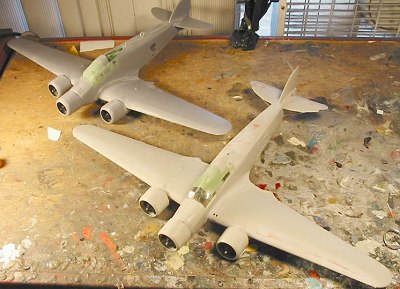 Both models were sanded smooth on their joints, with Mr. Surfacer applied to the Trumpeter kit after the putty was sanded down.
