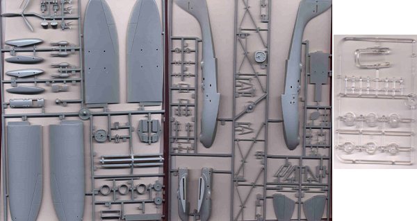 So here´s what you get from Italeri: I couldn´t quite find out when the kit was molded, but I guess it was in the 70ies. You get two sprues with parts in medium grey plastic and a sprue with clear parts, done with fine raised panel lines and rather heavy fabric detail on the control surfaces. There is neither flash nor sink marks or ejector pin marks in nasty places. The clear parts, although a little thick, are totally clear and will allow a good view of the near empty cockpit unless I do some scratch building.