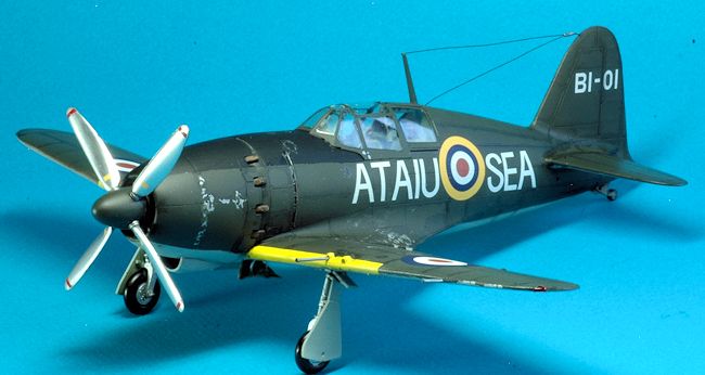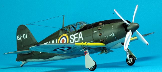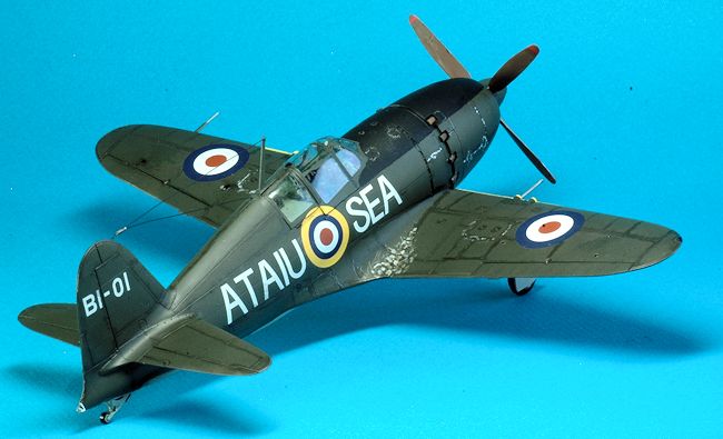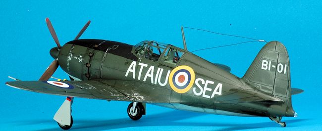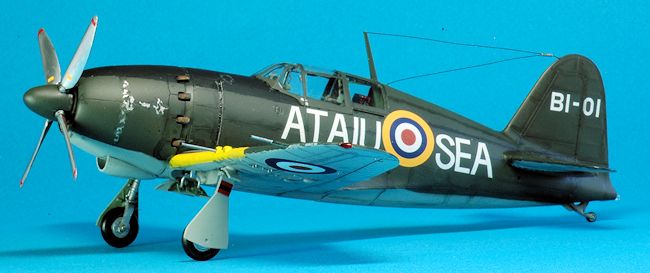 All interior parts were painted with Tamiya XF-71 Cockpit Green. The RAF version exterior was painted with Tamiya XF-61 Dark Green on the topside. The underside was painted with Gunze H61 IJN Gray. A black panel wash was applied to both aircraft. The RAF version has some aluminum chipping applied with a brush and a Prismacolor PC949 metallic silver pencil. I trimmed the front canopy window armor edge, the clear glass plate part N3, with Tamiya clear green. It had the same appearance as bullet proof glass would once edged with transparent green. Once decals were applied I finished the RAF version with Testors Dullcote # 1160 but used no cover coat on the NMF version.