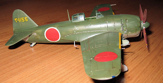 I masked off a few areas with 3M Blue tape (in particular the underside of the stabs) and then sprayed the FS34102. I didn’t care about leaving a consistent coat based on the photos I saw of late war Japanese planes. I let it sit for about an hour before I took some reduced tack 3M Blue (the tack or stickiness was reduced by rubbing it on the palm of my hand) and proceeded to remove paint. For once the weakness of Testors Acrylics worked to my benefit as the paint was removed while leaving the Tamiya Silver behind to produce the chipped paint effect.