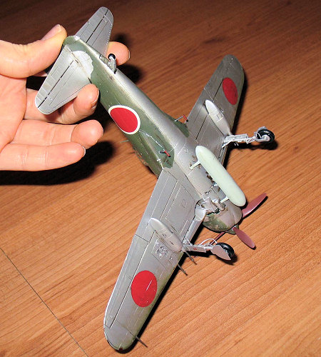 The underside fuel tank was supposed to be painted Mitsubishi grey, but I used Tamiya XF-12 IJN Naval Grey (apparently closer to Nakajima Grey) instead (close enough.)