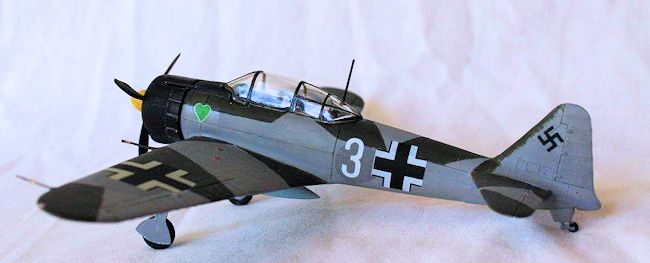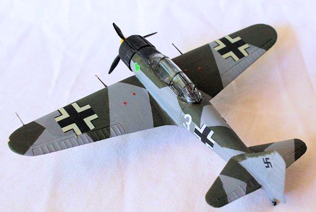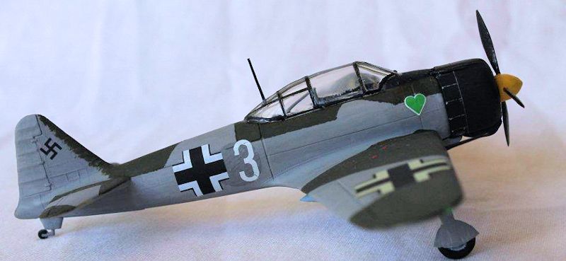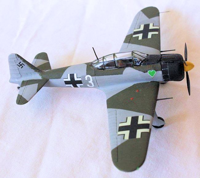 I had a set of 48-scale FW.190a decals, so I used these to give this Zero larger-than-normal balkencruzes on the wing tops (I saw a photo of a Heinkel 111 over Poland, with oversized crosses). The rest of the decals were stolen from a Messerschmitt that I’d painted Red Baron style (but that’s another story), so the rest of the markings were standard crosses. The tail swastikas came from a sheet of spares, as did the number 3. My good friend Don Williams of Moonie Ponds Models gave me the two 72-scale Green Hearts emblems I sought for my Zero to keep in line with my story.