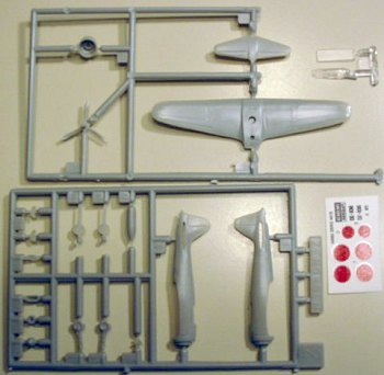 The fuselage consists of left and right halves, and a cowling/engine. Two prop hubs are provided—one with and one without prop blades. There is no engine detail inside the cowling. There are no cockpit parts, nor any interior detail at all. The cockpit consists of an appropriately shaped hole in the top of the fuselage, covered by a one-piece clear canopy. The canopy looks pretty good- not too thick, decent framing moldings, and clear.