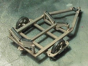 The trolley cart consists of 11 parts. I decided to drill out the axels and replace them with brass tubing. On test fitting the parts together, it looked like the join between the axel and the frame could turn out to be a weak link. I drilled out the wheels to accept a brass bushing, cut off the axel and drilled out the "retainer" part. Placing that part on the frame, I drilled through the retainer, through the wheel, into the frame itself. After painting, the brass axles were a press fit.