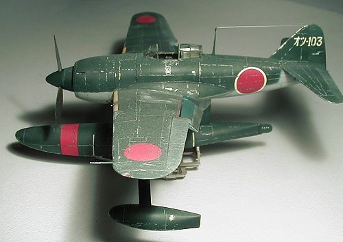 Hours later (after a full day’s work) I used a variety of masking materials to mask off the gray in preparation for the IJN Green. Materials such as electrical tape (because it follows compound curves), low-tack paper tape and Parafilm were all used. Masking off the floats and fuselage took me the better part of two hours. Most of that time was spent trying to get a piece of thread to stay 1/16th inch away from the wavy edge of electrical tape. This was done to get a soft-feathered edge on the demarcation line … tedious at best.