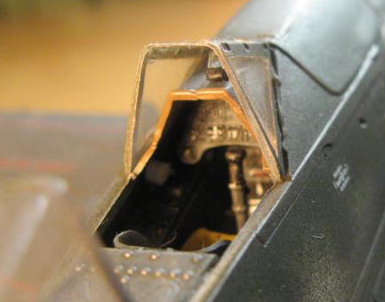 The remaining parts were added in preparation for painting. These included the drop tank/bomb rack, antenna, pitot tube, main landing gear and boarding step. The landing gear was painted RLM 02 and the main wheel hubs flat black and dry brushed lightly with RLM 66. I assembled the canopy slide and headrest and painted this and the inside of the canopy Model Master RLM 66. The assembly procedure for this is another area in the directions that are vague. I assembled this in the canopy as it helped to line things up easiest with them in place. Make sure to pay close attention so that everything lines up inside of the canopy.