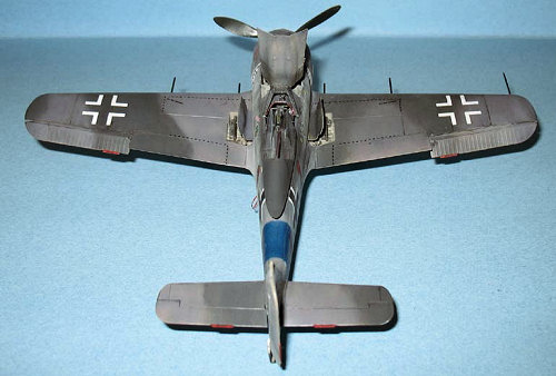 The prop, spinner, wheels, guns, cockpit detail bits (including PE), antenna (the PE versions) and various other bits were added. I drilled a hole in the canopy and inserted a thin aluminum wire (the radio aerial wire) which was held in place with a drop of white glue. One of the things I’m still awful at is radio aerial wire, but the radio aerial wire on the Wurger with the canopy open is loose and sloppy which is the typical condition of my craptacular aerials.
