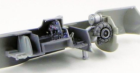 With the cockpit completed, I started in on the nicely detailed rear engine accessories section and tail wheel assembly. The 11-part accessories section nicely duplicates the engine components that are visible through the wheel wells. The various parts were painted aluminum, steel, or grey as appropriate, sprayed with Alclad Aqua Gloss (#ALC600), and washed with Black Tamiya Panel Line Accent Color (#87131). The tail wheel assembly consisting of a one-piece wheel captured between left and right halves of the wheel fork was painted with LifeColor acrylics and assembled with CA glue (Bob Smith Industries).
