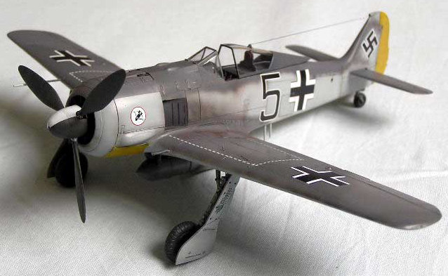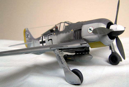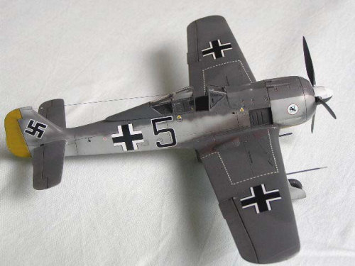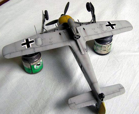 They came from the generous Skymodels sheet. The instructions depicts “Black 1” as Strakeljahn’s machine, but the “Jagdwaffe” book says that he flew “Black 5”, even that he had more than one. It also informs that “Black 1” was lost on 13 April, 1943, when hit by AA fire; Uffz Kurt Wendler was killed. A black “5” is also included in the sheet, so I used it. After some dreadful experiences I was wary of using Skymodels decals, but they went on without mishap; the generous undercoat of Xtracrylic Clear Gloss undoubtedly helped a lot. Some stencils came from the Tamiya kit decals, and I added a Yellow strip to the tail of the SC500, denoting general purpose high explosive.