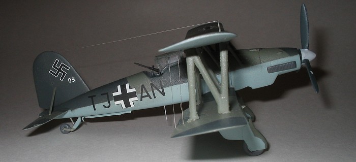 The instructions are correct in stating that the aircraft, true to Kriegsmarine fashion, should be painted a splinter pattern of 72 and 73 greens on the top surfaces, and 65 blue underneath. The problem I encountered is that I use ModelMaster paints, and either I am colorblind (I always pass my FAA eye exam, so I don’t think so) or the ModelMaster colors are so close that it is almost impossible to detect where one color ends and the other begins. Since photos show a distinct color separation pattern, I opted for a 71/73 pattern on the top, and 65 underneath. I started with the light blue, masked it off, and then painted the top in the illustrated splinter pattern. The landing gear covers are primarily light blue with a patch of 71 green on the leading edges, as shown in the available photos. The struts are all 71 or 73, and should be painted before assembly.