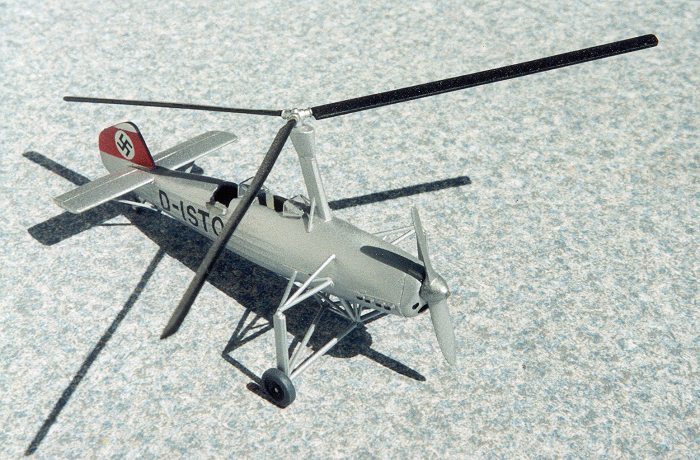 This was an easy model to paint. The entire aircraft, including propeller, was silver. The usual red banner tail marking of the Nazi Party was carried on the fin and rudder, and the registration letters, D-ISTO, were painted in black on the fuselage sides. I used Testors Model Master aluminum with flat black for the rotor blades. The tail banner was insignia red, while the white disk and swastika were Micro-Scale decals. After all paint and decals were applied, I oversprayed the whole model with Glosscote lacquer, which resulted in a very realistic looking model.