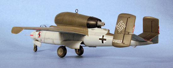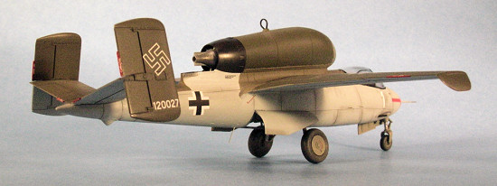 He-162 components were built and painted in several locations and just about all known photographs are in black and white, so camouflage colors are a problem. Often, the “official” RLM 76/81/82 camouflage pattern was either reversed, or the entire upper surfaces were just painted one color. Black and white photos make it hard to tell what camouflage colors were used, since there is little contrast between the two topside colors (if two were used at all). The undersides were painted RLM76 light blue, and one source states that the landing gear doors were often RLM65 Light Blue. Another states that the ailerons were painted RLM 82 top and bottom, since they were interchangeable between the left and right wings. After much searching, the only photos I could find of the undersides of the ailerons showed light-colored paint, so there may have been at least a little painting done at the final assembly point. Vertical stabilizers could have been underside or topside color, depending on where they were built. Many He-162s were unpainted, exposing the dark grey putty used to fill panel lines on the aircraft.