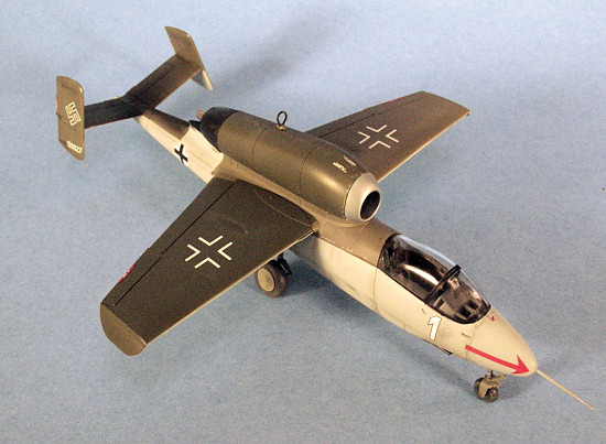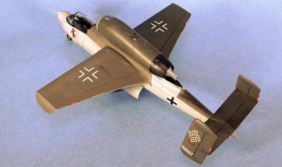 The Heinkel He-162 Spatz (Sparrow) arose out of a September, 1944 requirement from the German Air Ministry for a small, lightweight, jet-powered interceptor. It must be built by unskilled labor around the BMW 003 engine and must use a minimum of strategic materials. At some point during development, it was even suggested that the new aircraft be flown by novice pilots whose only previous experience was in gliders. Generalleutnant Adolf Galland vehemently opposed the "Volksjager" (Peoples' Fighter) project, on the grounds that it would drain valuable resources for the Me-262 and would be a death trap in inexperienced hands. Galland was overruled by Goering and others, so the project continued. The new fighter was to weigh about 4400 pounds, have a top speed of 466mph at sea level, and be equipped with two 20mm or 30mm cannon. Competing companies had just ten days to submit their proposals and the winning design had to be ready for production by January 1, 1945. Heinkel submitted a design with a metal fuselage, wooden shoulder-mounted wing, twin vertical stabilizers, and the engine mounted on top of the fuselage. In addition to the wings, the landing gear doors and nose cone were also made of wood. The main landing gear from the Bf-109 to simplify production. A simple ejection seat was fitted to ensure the pilot cleared the engine when bailing out. The design submitted by Blohm & Voss, which had its engine imbedded in the fuselage, was preferred by many officials because it used less aluminum in construction and it’s engine didn’t block the pilot’s view to the rear. Heinkel's proposal was accepted instead, because it had the best chance of meeting the required delivery dates and needed fewer man-hours to build.