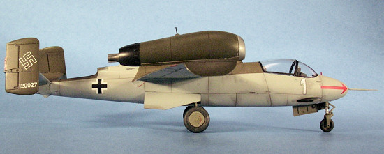 The aircraft was put into production as the 30mm cannon-armed He-162A-1 and the 20mm-armed He-162A-2. Only a few A-1s were built because the factory building the 30mm guns was overrun by the Soviet Army and, according to one source, the nose structure of the jet couldn't handle the recoil of the guns. Besides serial number, the only way to spot an A-1 is the cannon barrels barely protruded from the blast tubes and the shell ejection ports are larger, while the 20mm cannon barrels on the A-2 protruded quite a bit out of the blast tube. An unknown number of A-1s were built with 20mm cannon due to the supply shortage. One can only imagine the din inside the cockpit when the guns were fired, since the cannons were only inches from the bottom of the seat! The top speed of the A-2 was 553mph at sea level, and 562mph at 19,500ft. It's weight of nearly 6200 pounds was conveniently overlooked since the top speed of the little jet was so high.