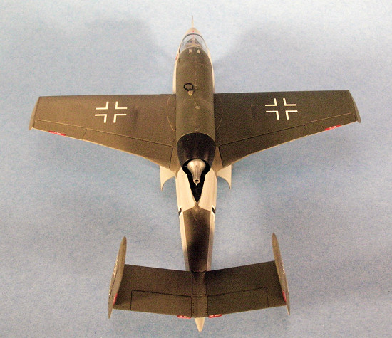 The intake and engine internal parts were painted aluminum, with other shades of silver for the details. The canopy frames on the He-162 were actually internal, meaning that the clear parts fit over a black metal frame and were then secured with screws from the outside. To be completely accurate, you should paint only the insides if the canopy frames black. I was lazy (and didn’t want to hear, “Hey, you forgot to paint your canopy frames,” so I painted the outsides of the frames. Once everything was dry, I sprayed a coat of Polly Scale Clear Gloss to give the decals a smooth surface.