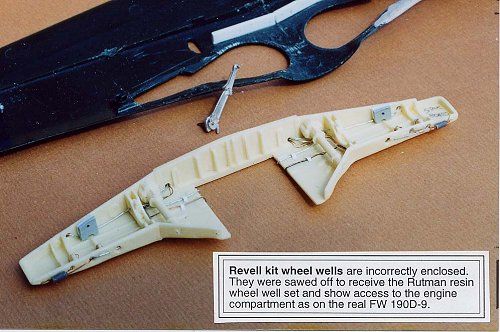For reference, I used the "Marian Krzyzan Aircraft Monograph #6" on the Dora and the Ta 152. It is a very good reference. Also, I strongly recommend the Squadron Signal "Walk Around" book (# 10) on the Dora. It is a wonderful reference for anyone wanting to build the Dora. It contains some great color photos of the restored Dora, 12 inches equals a foot scale. And both books have excellent color renderings of eye-catching profiles. The Squadron Signal book clearly shows that a portion of the wheel wells were open. Like several of the Dora kits available out there today, the Revell kit has the wheel wells closed in as I think they should be on the radial engined FW 190 A-8 aircraft. The photos I've seen make me feel you should be able to see the bottom of the engine, supercharger and oil tank if you look up through that opening from below.