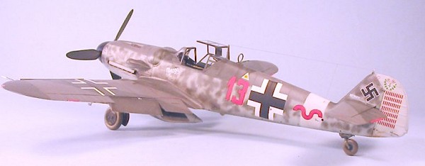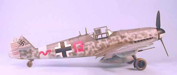There is one special note to the painting. The various profiles of this particular airplane show it with the “barber pole” paint scheme for the spinner. This was not adopted by the Luftwaffe until June 1944. While I couldn’t find a photo of “Red 13" to confirm this, all the photos of other JG 27 Bf-109G-6s from this period show black spinners with the white “flicker” marking, which is what I did for this model.
