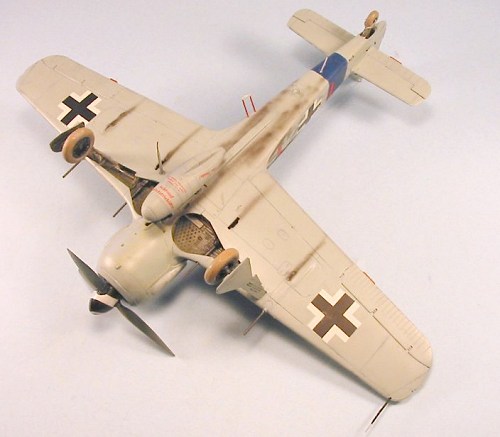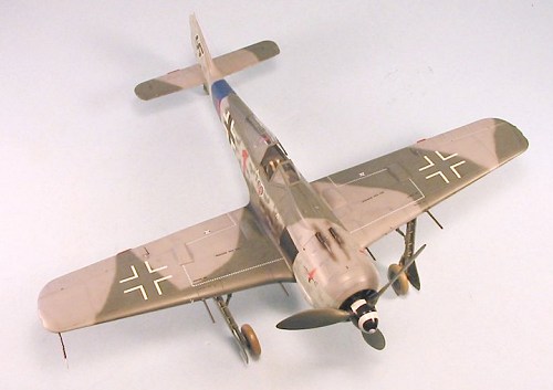 The kit shows the airplane with a yellow panel on the lower cowling. However, the spiral on the spinner dates the airplane to later than June 15, when this identification marking was instituted on the Western Front. At the same time, colored cowling panels were deleted as an ID marking and over-painted. I had painted the yellow panel before checking this in my research, so I over-painted it in such a way that - in person - one can see a few “holidays” (old Navy term for a not-so-good coat of paint) through the RLM76 over-paint. All these colors were lightened with post-shading by adding a bit of Tamiya “Sky Grey” to each mix and going over individual panel lines.