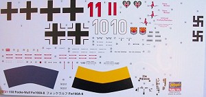 Decals are provided for two aircraft, that flown by Leutnant Hans Dortenmann of 2./JG54 during the Battle of Normandy in the summer of 1944, and the Anton-8 flown by Feldwebel Rudolf Artner of 9./JG5 in Norway during early 1945. These are the new-style Hasegawa decals where the white is really white, rather than ivory, making the decals very useable. Those who are challenged in painting and masking the Reichverteidigung bands will be happy to know that decals are provided for these items.