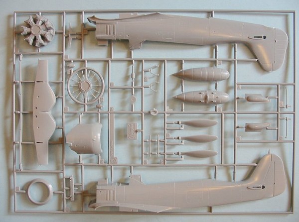 The kit shows the influence of the 1/48 DML Fw-190 kits in the design of the engine cowling; however, this cowling looks to be far easier to assemble than the DML offering. The kit shares the same wing and undercarriage assembly - other than having a completely enclosed wheel well - with the earlier Dora kit, which means it is virtually foolproof when it comes to getting the gear legs installed at the correct angles. The cockpit is sparse in comparison with what one can get in resin aftermarket sets, but given that the cockpit is not that visible once completed, it is more than adequate for all but the most addicted resin-a-holic. The only aftermarket bit I could suggest would be the Cutting Edge posable resin seat belts, since the seat is the most-visible item in the cockpit in the completed model. The windshield and flat-top canopy are very clear and of scale thickness.
